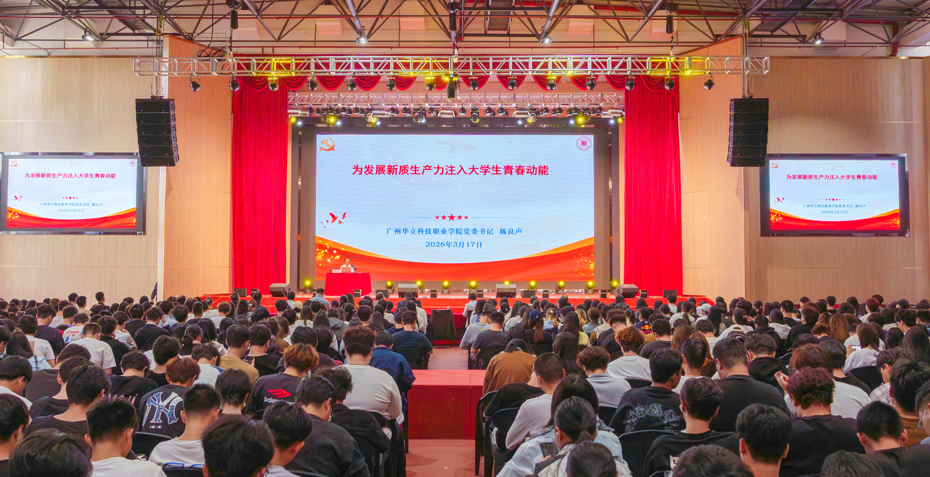 3月17日下午,云浮校区文体楼八楼报告厅内座无虚席,800余名师生代表齐聚一堂,共同聆听了学校党委书记陈良声同志主讲的2026年春季学期“思政第一课”。本次课程以“为发展新质生产力注入大学生青春动能”为主题,既有理论高度,又贴近学生实际,引发热烈反响。学校党委副书记、副校长高尧来,学校校党委委员、校长助理张剑锋,云浮校区各二级党组织负责同志及马克思主义学院教师一同参加学习。课程由学校党委副书记、副校长王洪艳主持。