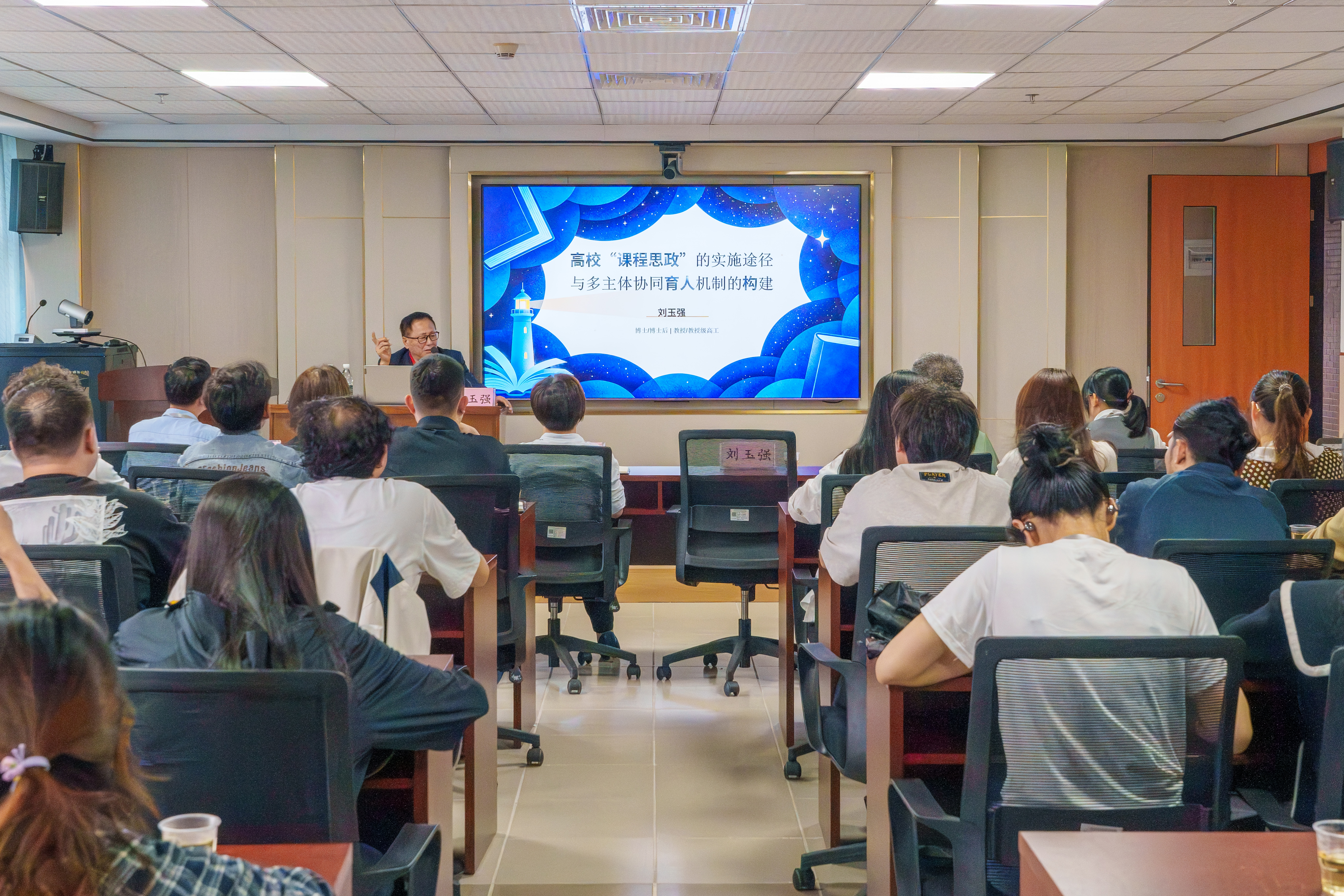 讲座中,刘玉强教授紧扣课程思政核心要义,立足新时代高校育人新形势,从时代背景、实施路径、关键关系统筹、多主体协同四大维度展开深度讲解。他结合自身多年研究与实践经验,剖析当前高校思政教育面临的思想多元化挑战,明确指出2018年全国教育大会后,思政教育已成为高校人才培养的核心,破解思政课与专业课“两张皮”困境,是当下高校育人改革的紧迫任务。