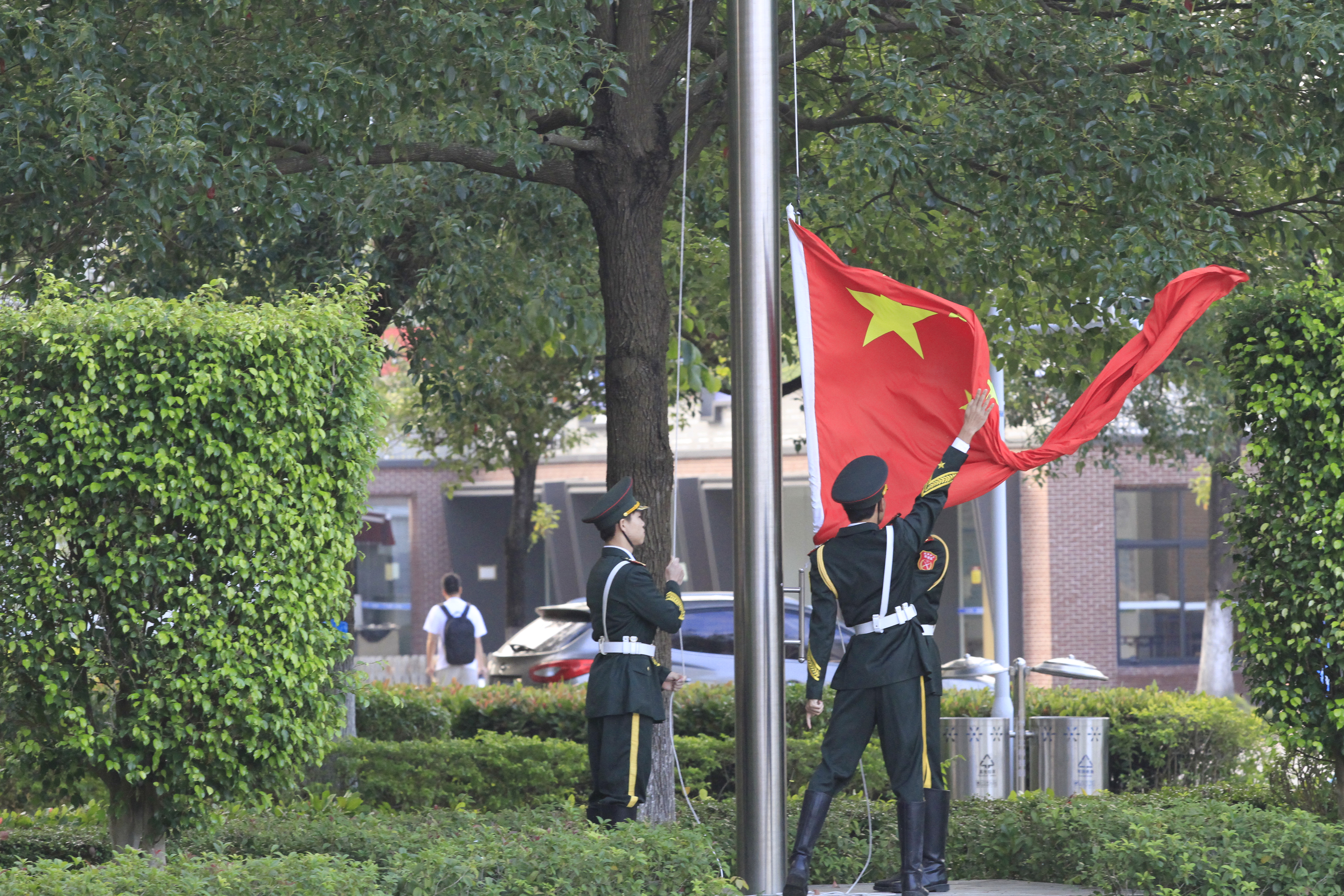 迎着朝阳,我校国旗护卫队迈着整齐划一、铿锵有力的步伐,昂首阔步护卫着国旗走向升旗台。当慷慨激昂的国歌声奏响,升旗手虔诚而庄重地将国旗扬起,全体师生整齐列队,行注目礼。在嘹亮歌声中,鲜艳的五星红旗冉冉升起,迎风飘扬。
