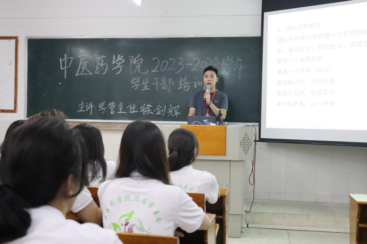 为加强中医药学院团委学生会队伍建设,提高学生干部的能力与素养,中医药学院于2023年11月2日在西二教学楼举行了2023-2024学年第一次学生干部培训会。第一届团委学生会全体成员参加,本次培训会由中医药学院学管主任徐剑辉老师主讲。