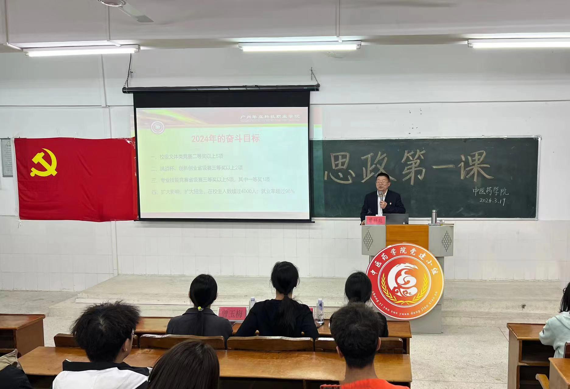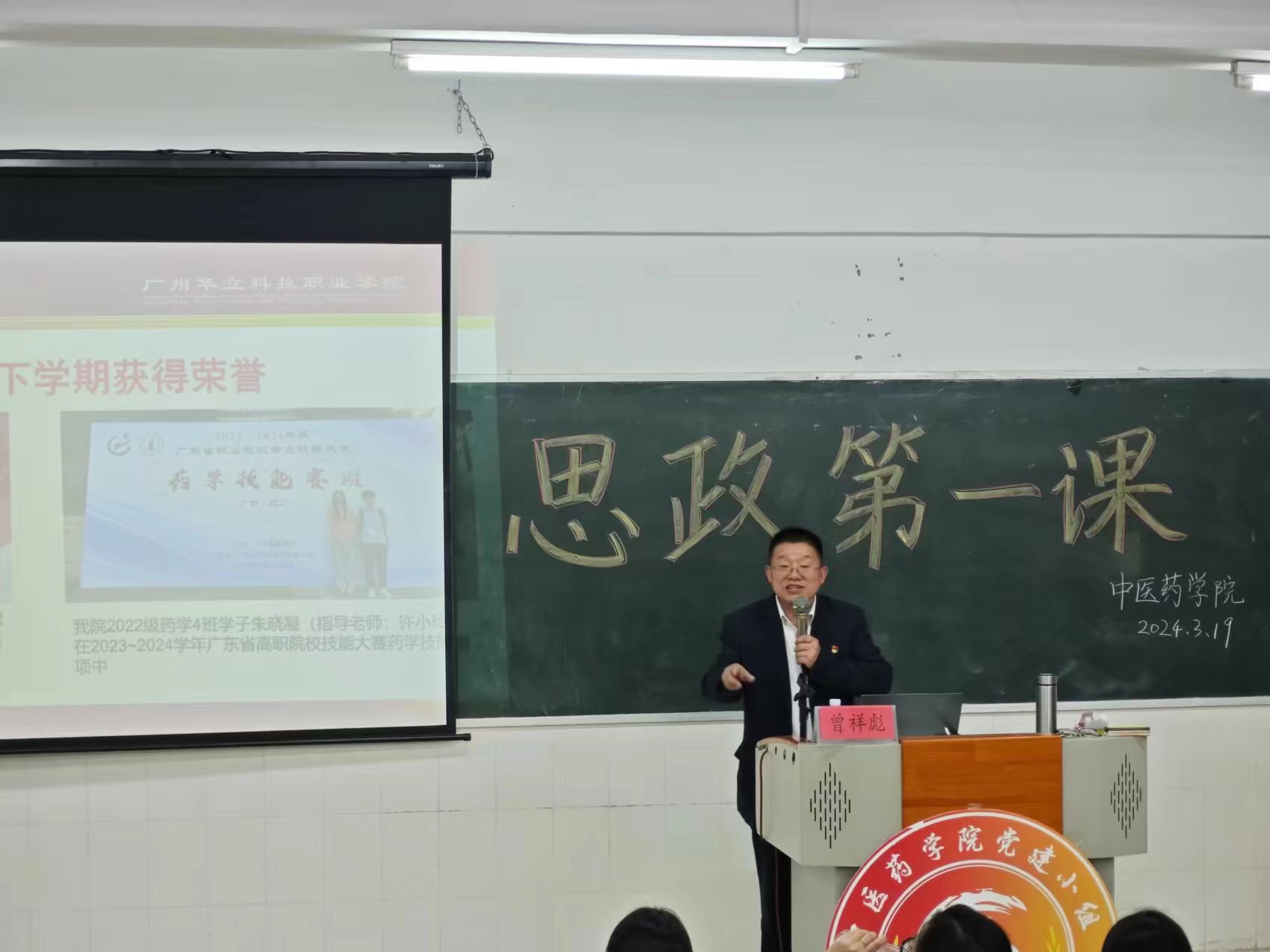 为深入学习贯彻习近平总书记关于职业教育工作的重要指示批示精神和两会精神,切实做好学生的思想引领,3月19日晚在图书馆304教室,中医药学院直属党支部书记曾祥彪以“学习贯彻两会精神,扎实推动学院高质量发展”为主题,为党建小组全体干部、各年级各专业的学生约160人讲授了2024年春季学期书记思政第一课。思政第一课由党建小组指导老师曾玉梅主持。