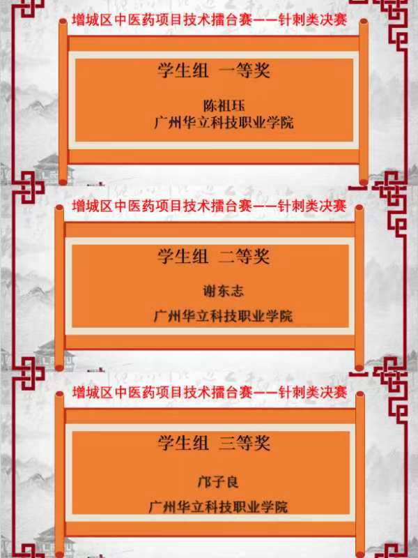 7月10日,首届广州市增城区基层中医药服务能力提升工程之中医药项目技术擂台赛”在正果镇卫生院成功举办。经过激烈角逐,在“针刺”类项目竞赛中,我院学子分别斩获一、二、三等奖的好成绩。