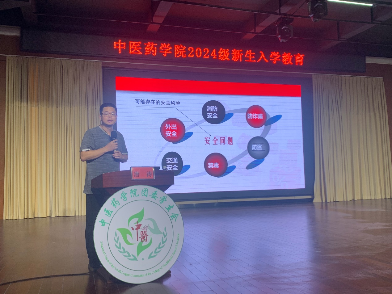 接下来,第二环节由学校保卫处唐涛老师上台讲解安全教育,为新生们敲响警钟,通过案例分析和实用建议,增强他们的安全意识和自我保护能力。安全是生命的基石,牢记安全是对自己负责也是对他人负责,希望同学们时刻谨记用火、用电安全,增强防诈骗意识,顺利度过大学生活。