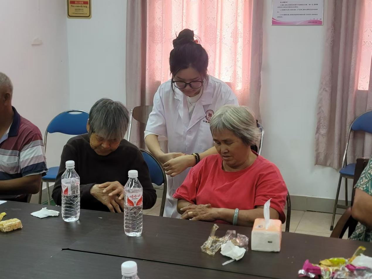 讲座结束后,钟老师指导志愿者们开展测量血压、艾灸、推拿等中医理疗服务。在服务过程中,志愿者们为大家讲解艾灸的操作方法和注意事项,针对一些基础穴位进行仔细讲解并进行手把手教学。此外,志愿者还用专业的手法进行推拿,帮助他们缓解身体的不适,并根据个人需求和身体状况推荐一些基础的自我保健手法。