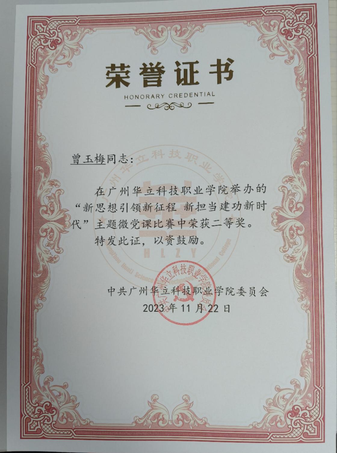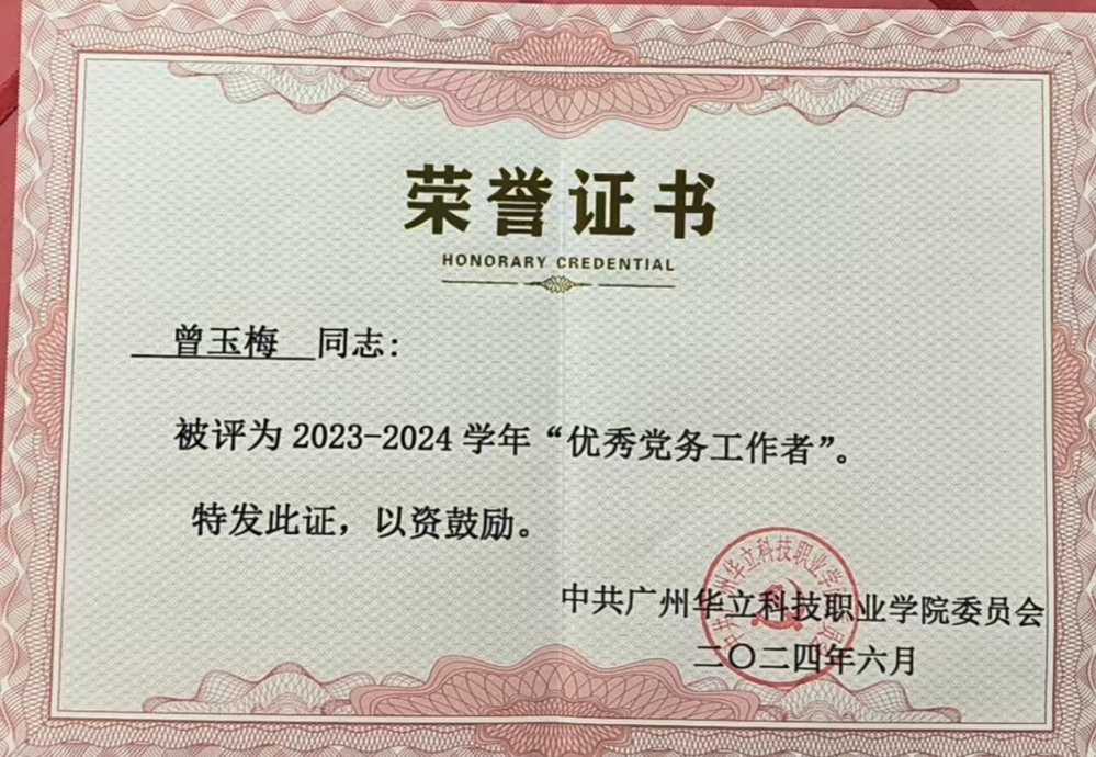 曾老师在担任广州华立科技职业学院中医药学院直属党支部宣传委员期间,她以高度的政治责任感和使命感,默默耕耘在党务工作的第一线。她深知作为一名党务工作者,必须时刻保持对党的忠诚和对人民的热爱,用实际行动诠释着党性的光辉。