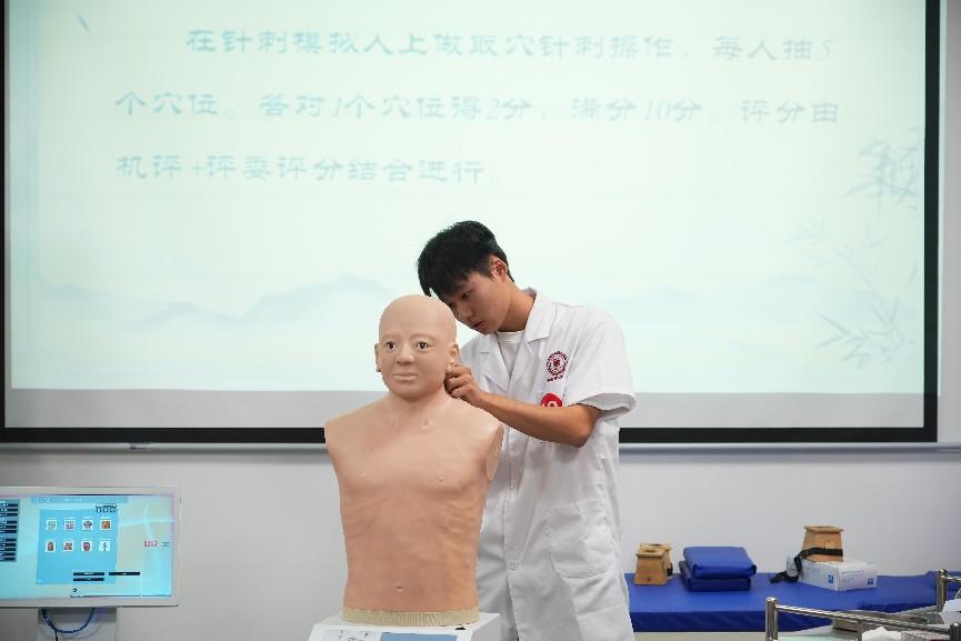 本次大赛共分为两个环节,旨在全面检验选手们的中医临床综合能力。第一环节为“针刺取穴”,选手们需要在针刺模拟人上精准找到并操作指定的穴位。这一环节不仅考验了选手们的针灸技能,更检验了他们对中医经络理论的掌握程度。