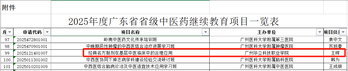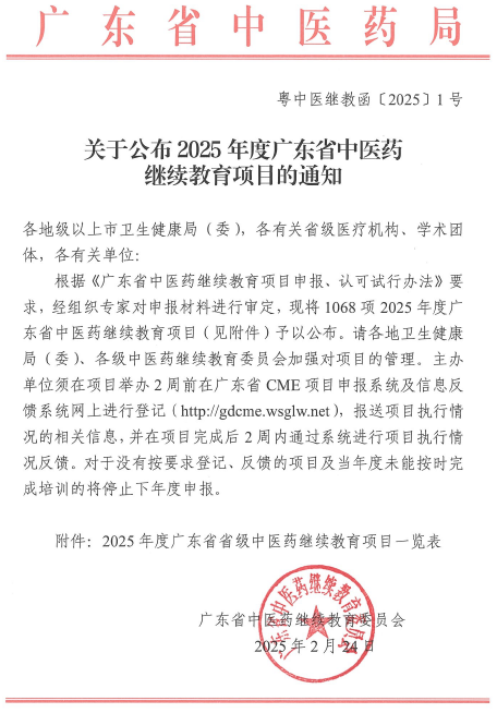 2025年2月25日,由潘菽弢博士起草申报的《经典名方制剂在基层中医临床中的合理应用》成功入选2025年广东省中医药继续教育项目(CME)。这是我校首次获得此类继续教育项目举办资格。