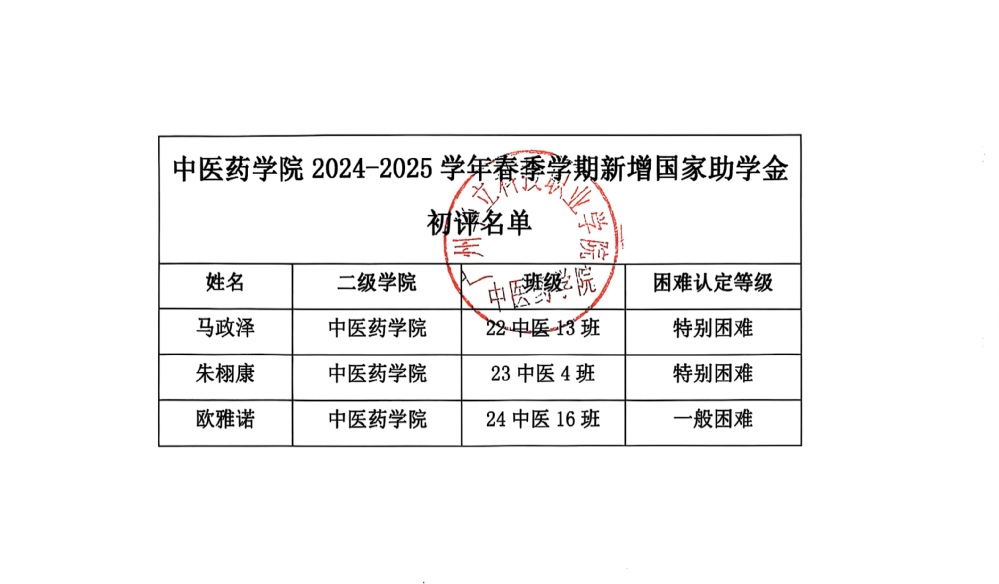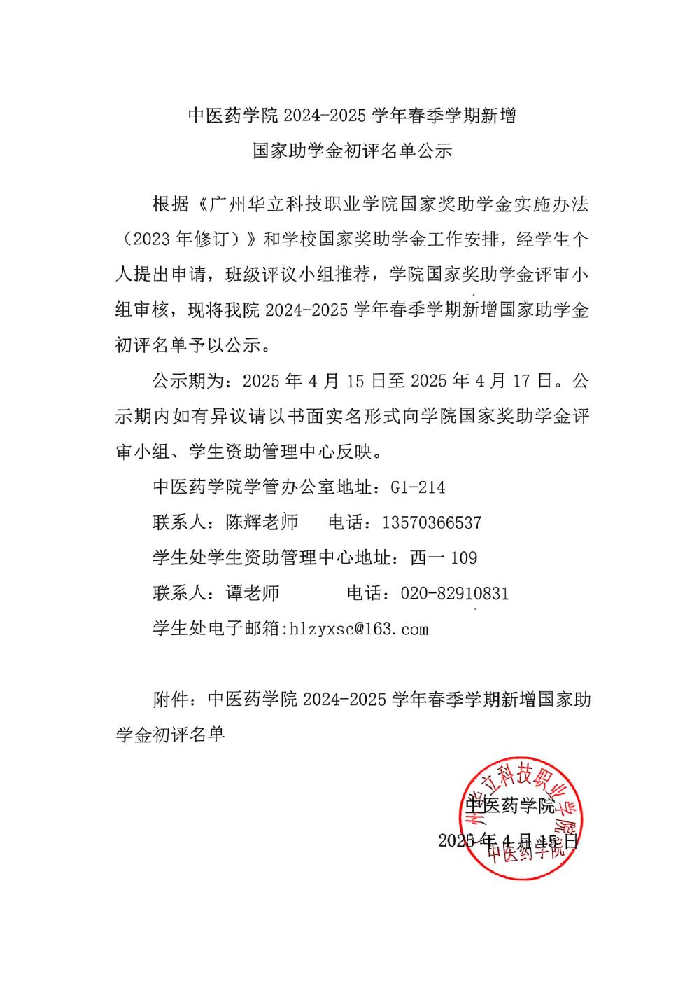 根据《广州华立科技职业学院国家奖助学金实施办法(2023年修订)》和学校国家奖助学金工作安排,经学生个人提出申请,班级评议小组推荐,学院国家奖助学金评审小组审核,现将我院2024-2025学年春季学期新增国家助学金初评名单予以公示。