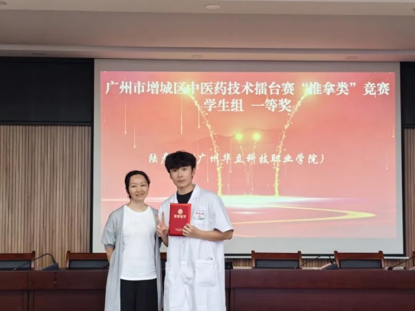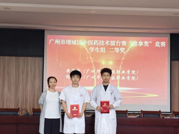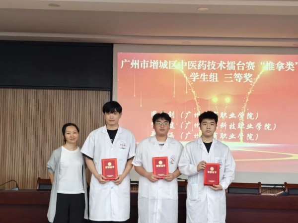 2025年5月20日,“广州市增城区中医药项目技术擂台赛(推拿类)”在广州增城区派潭镇中心卫生院举办。来自广东省增城区各基层医疗卫生机构、广州华立科技职业学院及广州华商职业学院的60多名参赛选手以饱满的热情、超高的专业水平完成竞赛。经过理论知识考核和推拿技能考核两场的激烈角逐,由我校教师薛啸指导的中医学专业陆彦合、黄华科、谢政行、李铭健4名同学凭借出色的表现,荣获个人赛一个一等奖、两个二等奖和一个三等奖。