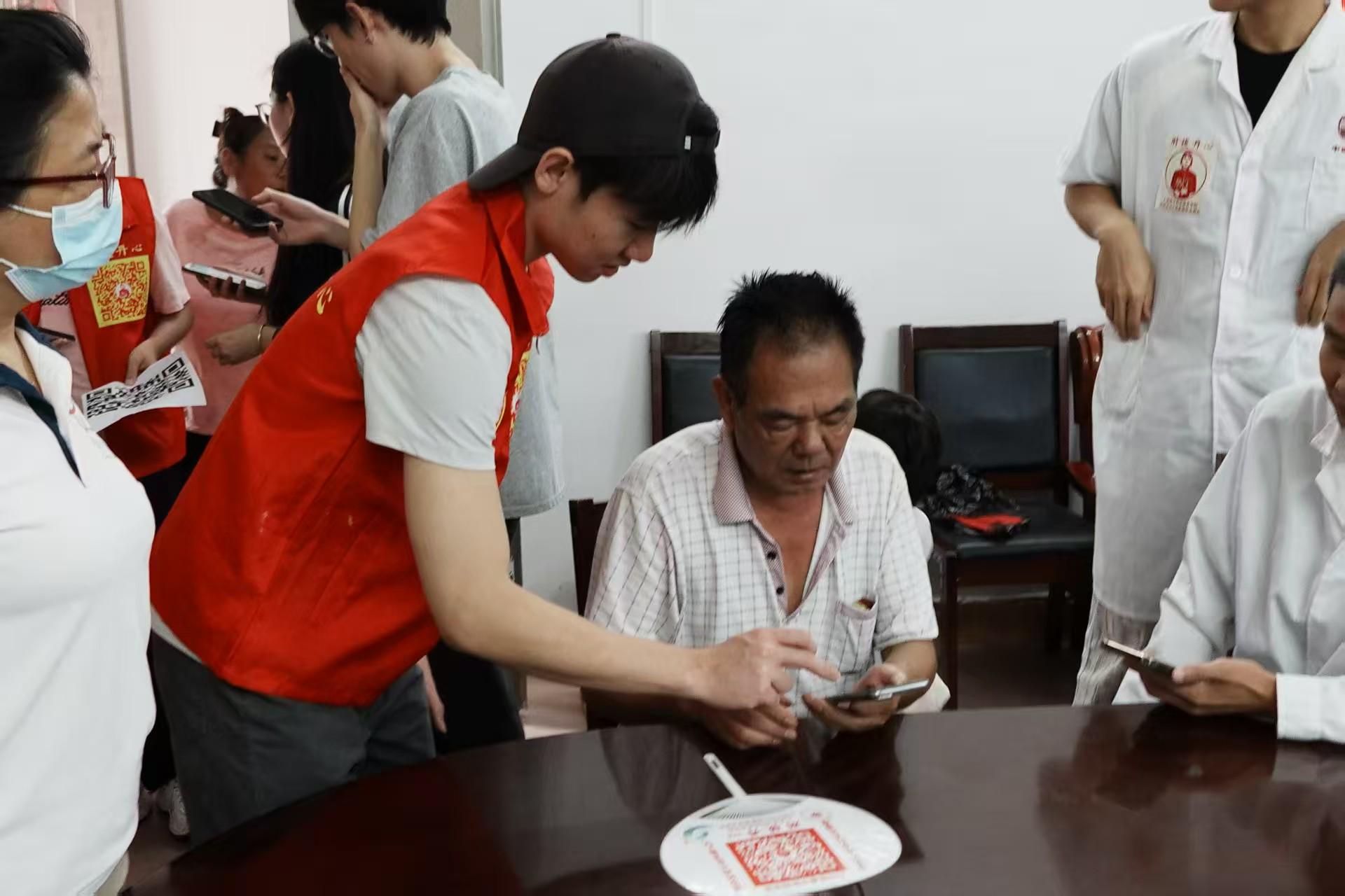 义诊现场,闻讯赶来的村民们体验了艾灸、推拿、锤疗等中医特色外治疗法。针对许多村民主诉的肘痛、颈痛等各种疼痛,义诊团队在潘菽弢博士带领下,一面通过望、闻、问、切,细致地为村民分析这些疼痛的成因和核心病灶点,一面用娴熟的手法精准定位病灶点,取得立竿见影的疗效。之所以能取得这样的效果,是因为该团队自今年4月份起就启动了乡村居民治疗需求和中医新媒体认知情况的问卷调查,根据调查发现的乡村居民高发病种,拍摄了一系列治疗这些疾病的短视频作品,并凭借这些调查报告和中医乡村公益短视频斩获了“挑战杯”、“大创”等科创竞赛奖项。今天村民主诉的这些疼痛,正是团队之前的短视频专辑“诸痛备急方”中重点讲解的病种。因此在治疗队员治疗疼痛的同时,负责视频推送的同学就给排队等待的村民播放相应的短视频作品,让他们在这种“案例教学”中切身体会到中医的优势和中医短视频的便利性。