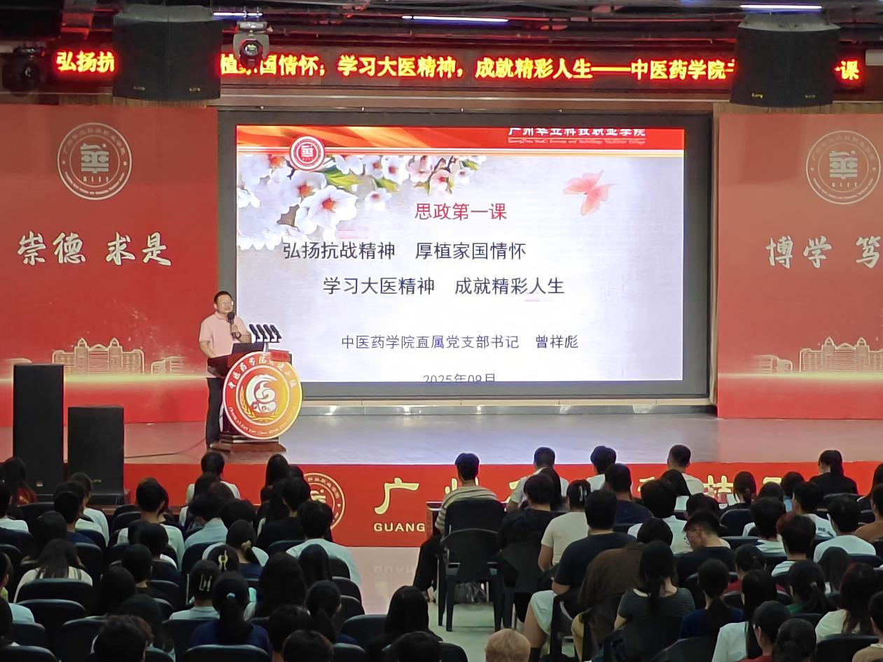 2025年9月8日晚,中医药学院副院长、直属党支部书记曾祥彪,以“弘扬抗战精神,厚植家国情怀;学习大医精神,成就精彩人生”为主题,为学院2025级新生讲授了一堂思想深刻、内涵丰富的思政第一课。同学们在庄重而热烈的氛围中不仅经历了一场思想深度的精神洗礼,还在课程的指引下系好大学的“第一粒扣子”。