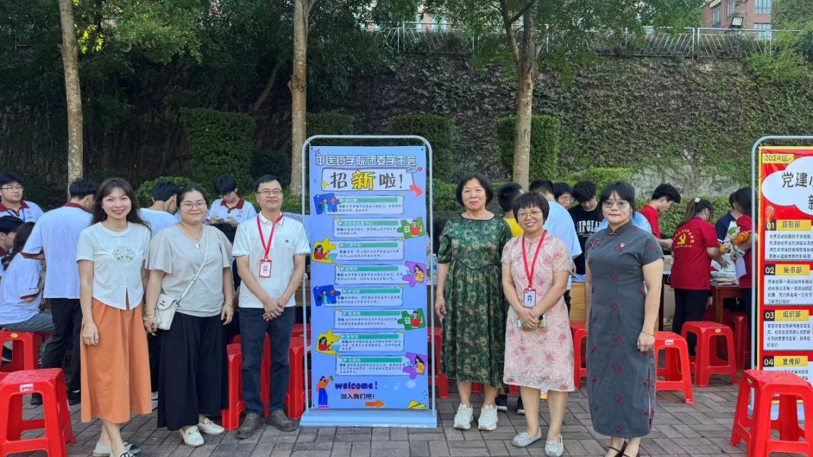 活动现场,招新摊位前人流涌动,学校副校长王洪艳、校办副主任林子云、校团委书副记宋依谜与中医药学院副院长张志勇、陈耀辉等老师在现场观摩并指导招新工作。