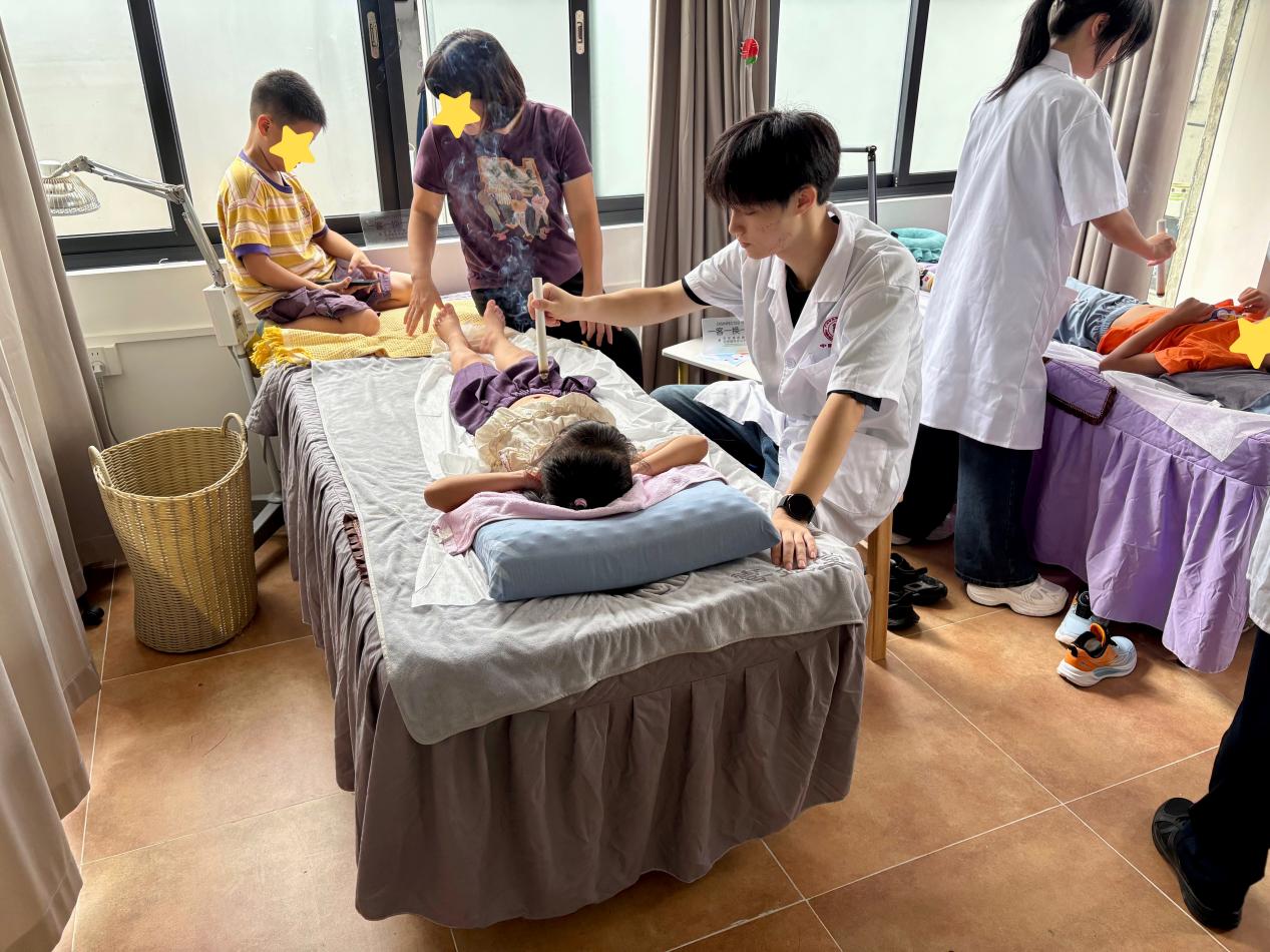 在随后的治疗环节,艾灸与推拿等中医外治法成为舒缓孩子身心的重要媒介。 根据前一轮诊断评估的结果,志愿者们“因人施术”,针对孩子们普遍存在的睡眠障碍、肠胃不适等问题,选取相应的穴位和经络,施展温和的艾灸与推拿手法。当清雅的艾草香气在空气中弥漫,当志愿者们用温暖的手掌轻柔地按摩孩子们的头部、四肢及腹部,许多原本焦躁的孩子逐渐平静下来。这些手法旨在调和气血、放松神经,现场可以看到,一些孩子在接受按摩后,面部表情变得柔和,身体也不再紧绷。整个过程不仅是技术的施展,更是一场无声的陪伴与疗愈,让抽象的“中医”化为了可感、可知的温暖触摸。