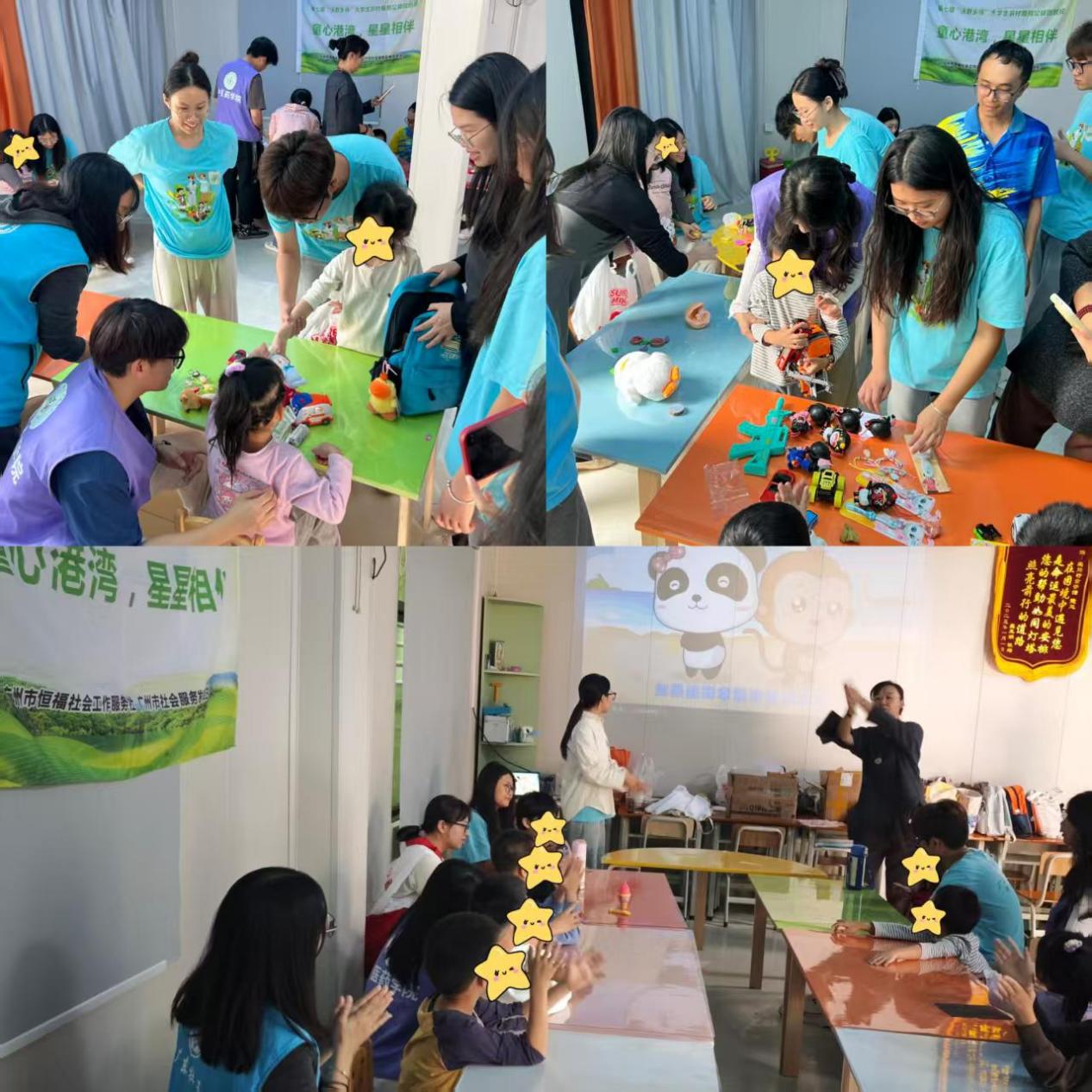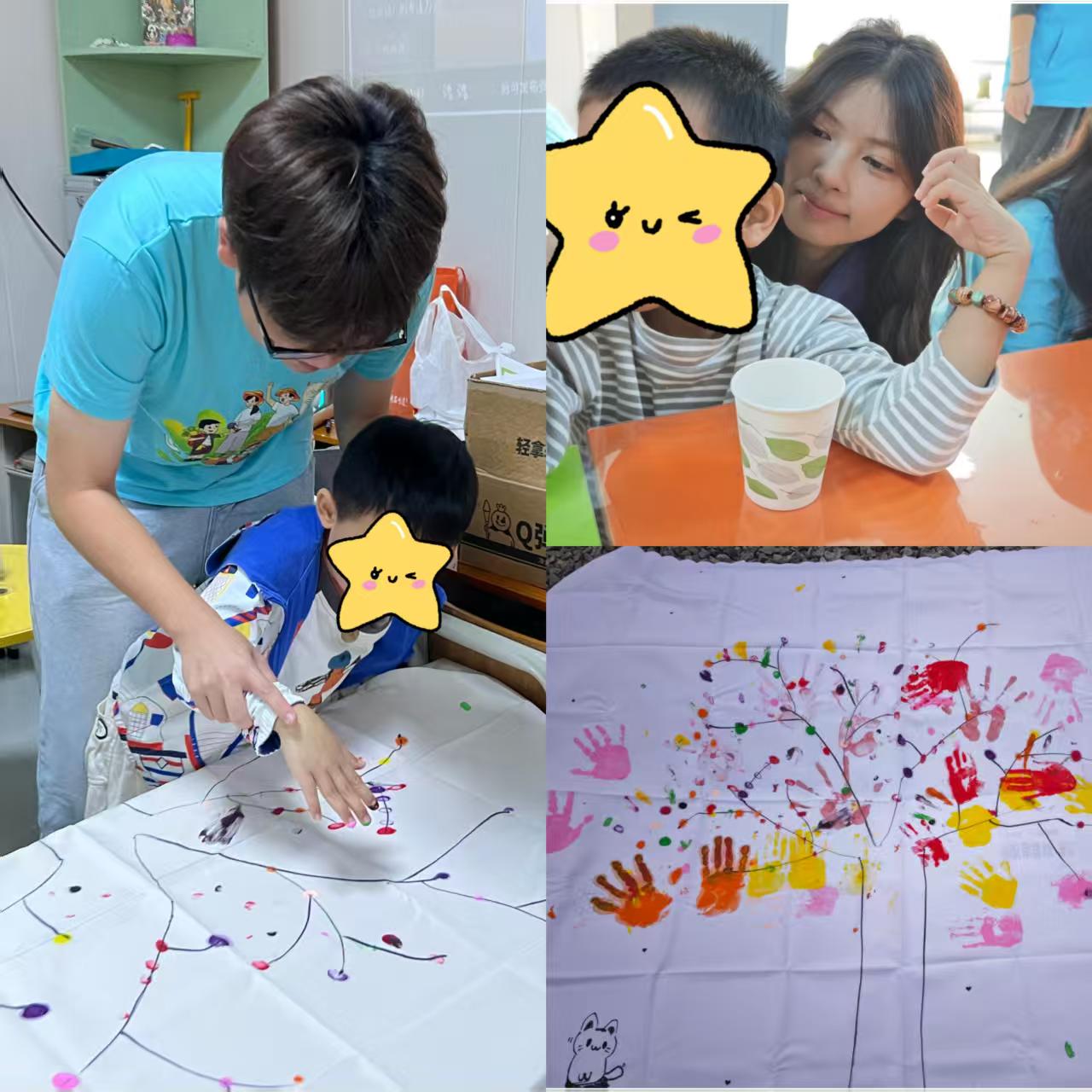 活动围绕“感官艺术,与爱同行”和“星宝闲置,爱与交换”两大主题展开,通过富有创意的形式,为自闭症儿童及其家庭提供专业支持与情感温暖。在“感官艺术,与爱同行”环节,志愿者们设计了丰富的感官训练内容:孩子们在《幸福拍手歌》的欢快旋律中完成拍手、跺脚等感统训练;通过手工串珠锻炼手眼协调能力;更用手印创作出独一无二的“手印树”,实现视觉与动作的协同发展。这些活动不仅有效促进了孩子们的感官统合能力,也在潜移默化中提升了他们的认知与学习水平。