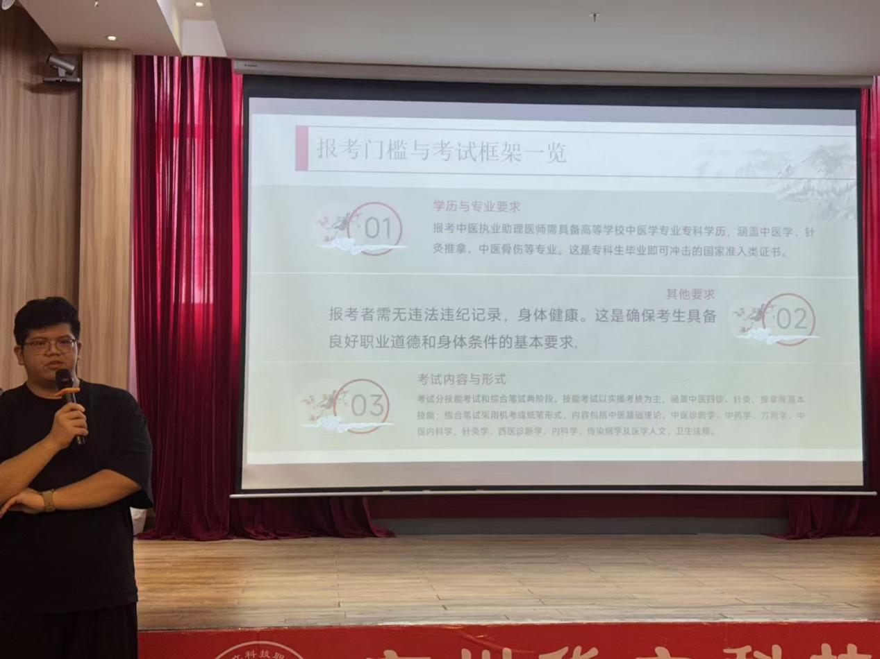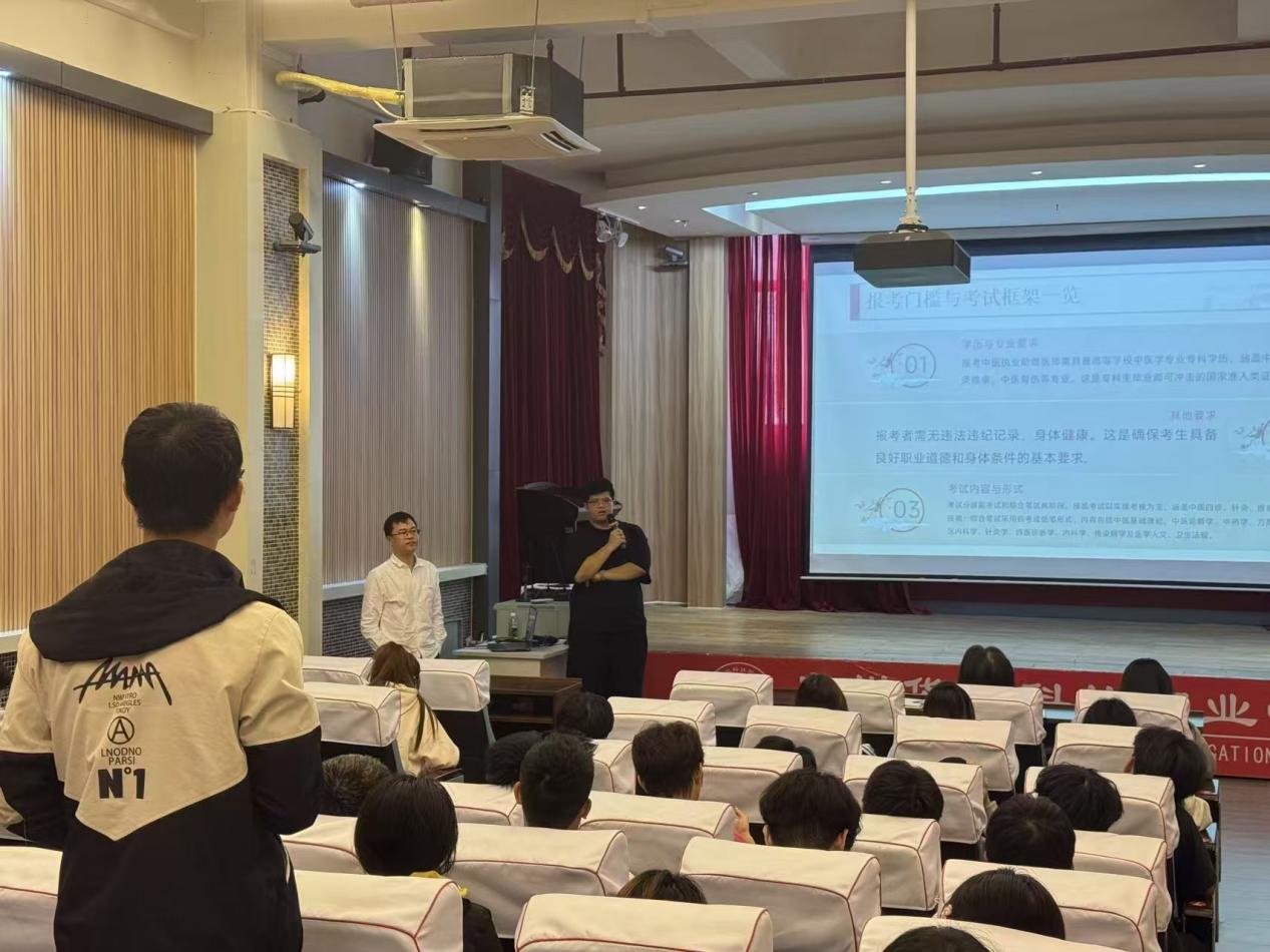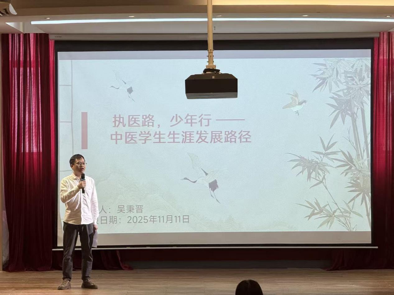 随后,吴秉晋老师以“执医路,少年行”为主题开展专题分享。吴老师结合自身经历,从中医药行业就业现状、职业发展方向、专业学习、升学以及考证等多个维度为同学们进行了系统讲解,还针对同学们普遍关心的职业选择困惑、能力提升重点等问题给出了具体建议。