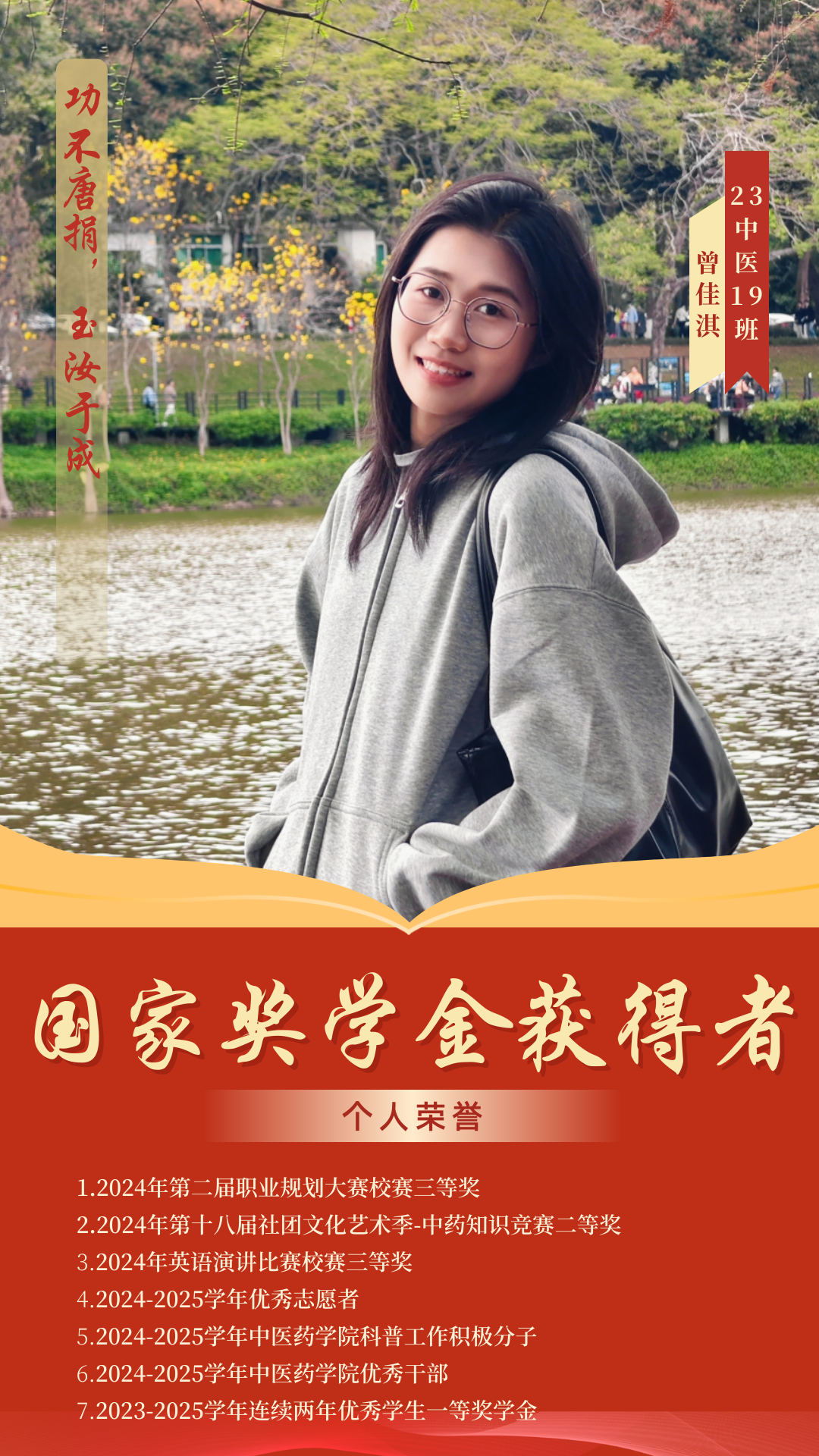 杏林绽芳华,巾帼竞风流。在2024-2025学年国家奖学金评选中,我院四名优秀学子凭借扎实的专业素养、勤勉的治学态度和卓越的综合表现脱颖而出,成功斩获国家奖学金,用青春实绩诠释了中医药学子笃学求真、砺行致远的优良风貌。榜样力量催人奋进,青春风采薪火相传。今天,让我们一同走近这四位优秀的巾帼学子,聆听她们深耕杏林、逐梦前行的奋斗故事,汲取榜样力量,感悟青春担当,在传承中医药薪火的道路上携手奋进、共谱华章。