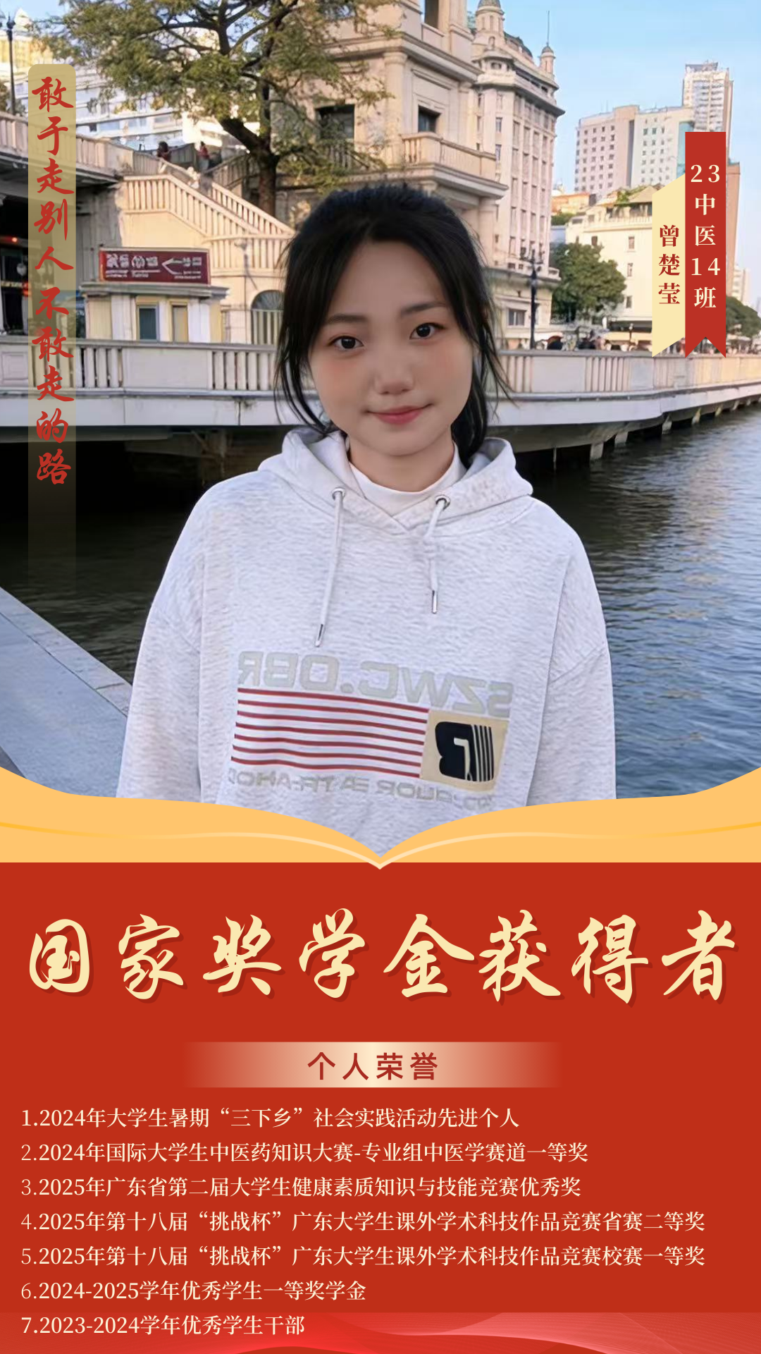 在学业之路上,她勤学善思、笃学不倦,深耕中医药专业知识,潜心钻研专业本领,以综测成绩专业第一、绩点4.23的优异成绩,夯实专业学识根基,用扎实的成绩彰显中医药学子的勤学本色。她深知,中医药的传承与发展,贵在知行合一、技精于勤。在专业技能的赛场之上,她厚积薄发、屡创佳绩:斩获首届中医保健康复技能大赛拔罐类单项个人一等奖、团体一等奖;拿下2025年广州市增城区中医药项目技术擂台赛针刺类竞赛学生组一等奖、刮痧类竞赛学生组二等奖。每一份荣誉的背后,都是她深耕岐黄、苦练技能的坚守,更是她扎根专业、精益求精的初心,尽显中医药学子扎实的专业功底与过硬的实操本领。
