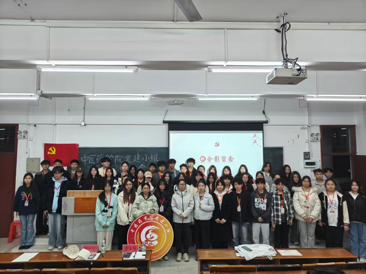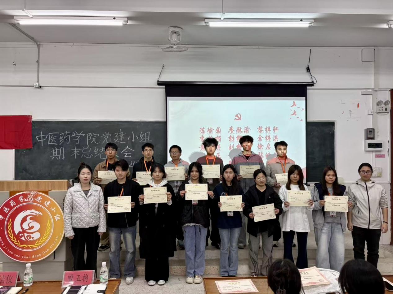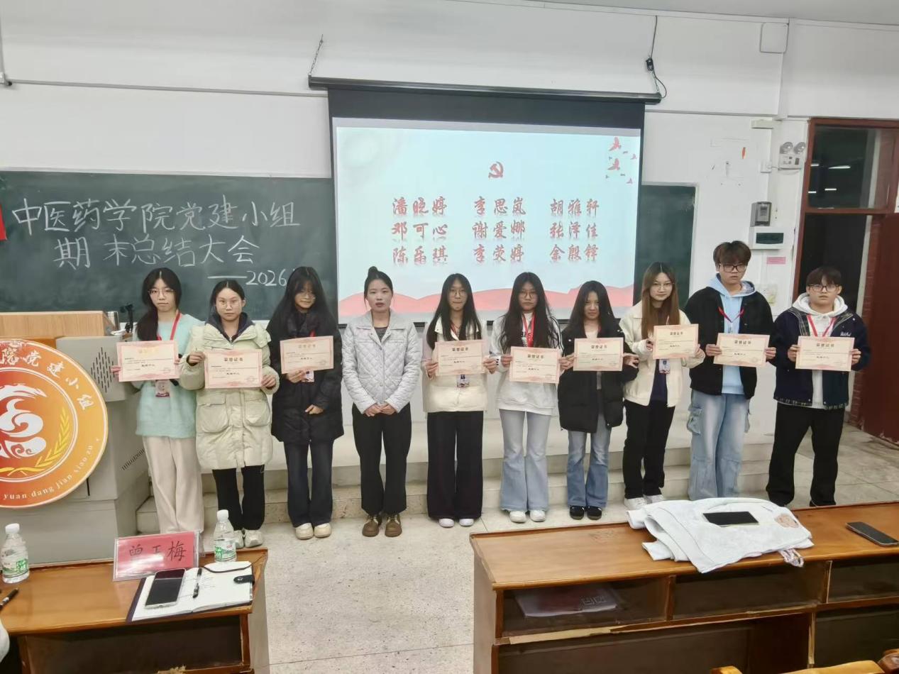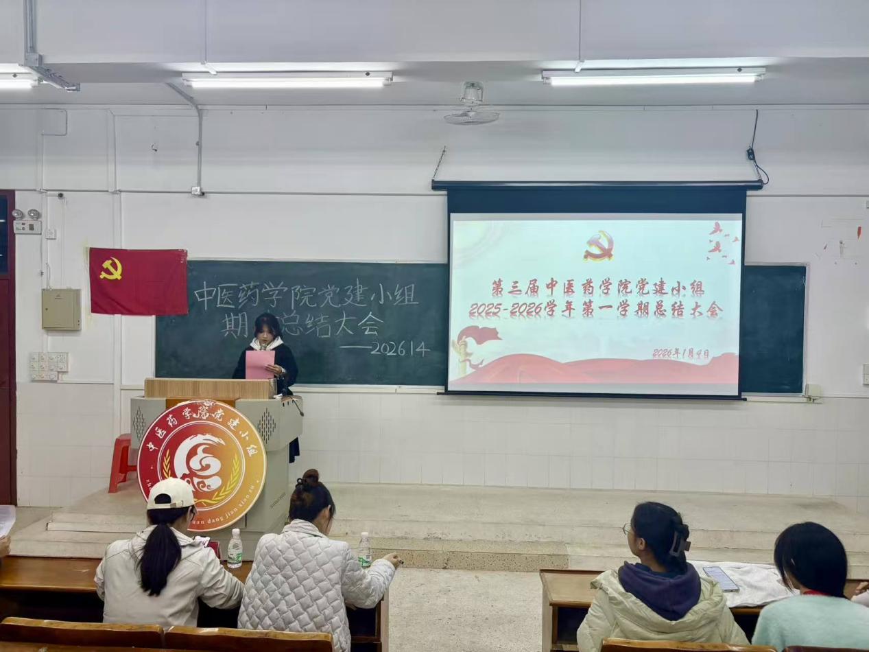 2026年1月4日晚,中医药学院党建小组在图书馆303教室召开2025-2026学年第一学期工作总结大会,全面回顾了过去一学期党建小组的工作成果与成长历程,精心谋划下一学期的发展。指导老师郑洁仪、曾玉梅及全体党建小组成员齐聚一堂,共同总结过往、表彰先进、展望未来。