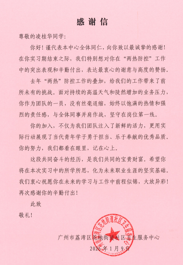 近日,广州市荔湾区花地街道社区卫生服务中心正式向我院发来三封感谢信,对 2023 级实习生李淑冰(23 中医 17 班)、凌桂华(23 中医 17 班)、李梓恒(23 药学 6 班)在基层实习期间的优异表现给予高度评价与特别表扬,充分肯定了三位学子的职业素养与实践能力。