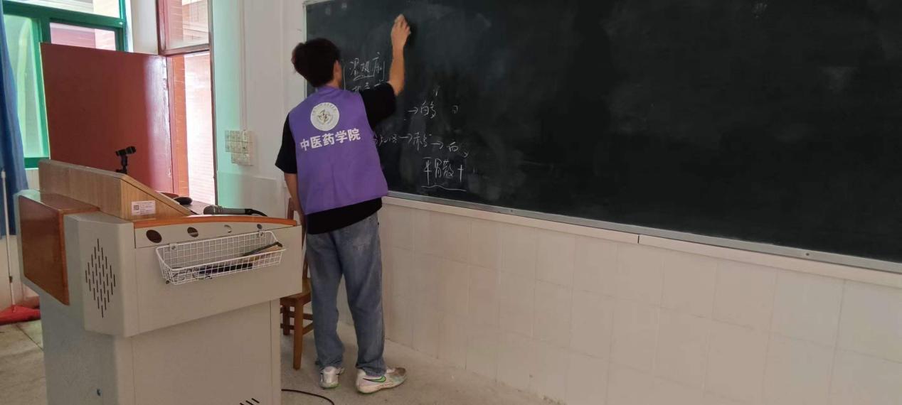 志愿者手持黑板擦与湿抹布,逐间走进教室,仔细擦拭黑板上的粉笔字迹与浮尘,反复清理黑板边框与角落的积灰,让原本布满板书的黑板恢复整洁清爽,为后续课堂教学提供干净的书写环境。