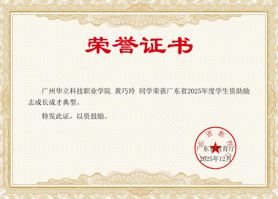 经济管理学院23会计4班黄巧玲同学荣获“广东省2025年度学生资助励志成长成才典型”。
