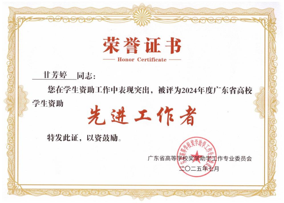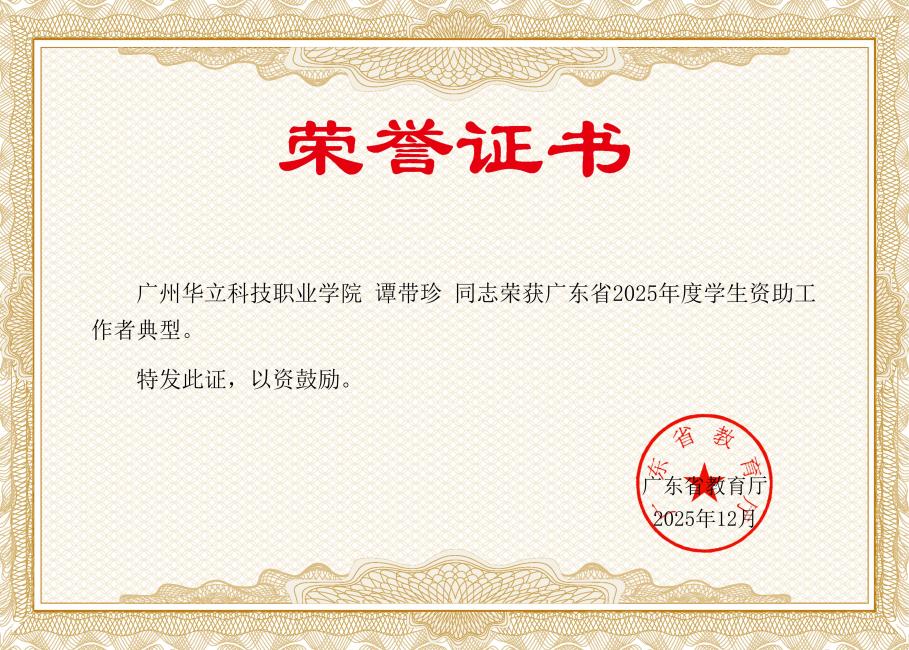 谭带珍老师荣获“广东省2025年度学生资助工作者典型”。