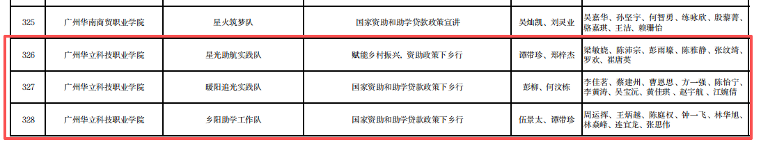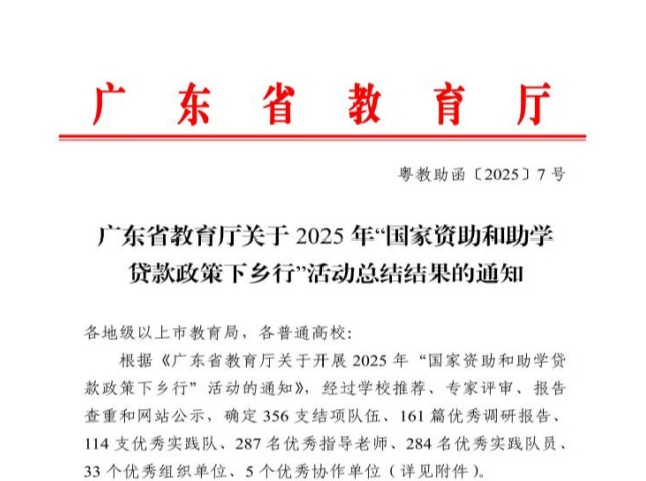 广东省教育厅公布2025年“国家资助和助学贷款政策下乡行”活动总结结果,我校受奖助学生组成的3支实践队伍深入乡镇,开展资助政策宣讲、调研走访及帮扶服务等志愿活动,顺利结项;伍景太、何汶栋两位老师悉心指导、全力护航,获评“优秀指导老师”;艺术与传媒学院梁敏娆、计算机信息工程学院李佳茗两位同学积极参与政策宣传工作,以青春之力传递资助温情,获评“优秀实践队员”。